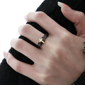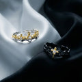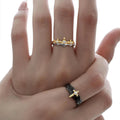 The knight ring features a bold dark finish with a golden centerpiece, while the crown ring shines with delicate points and clear stones.