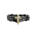 One features a dark band with a golden cross, the other shines with a crown design and sparkling stones.